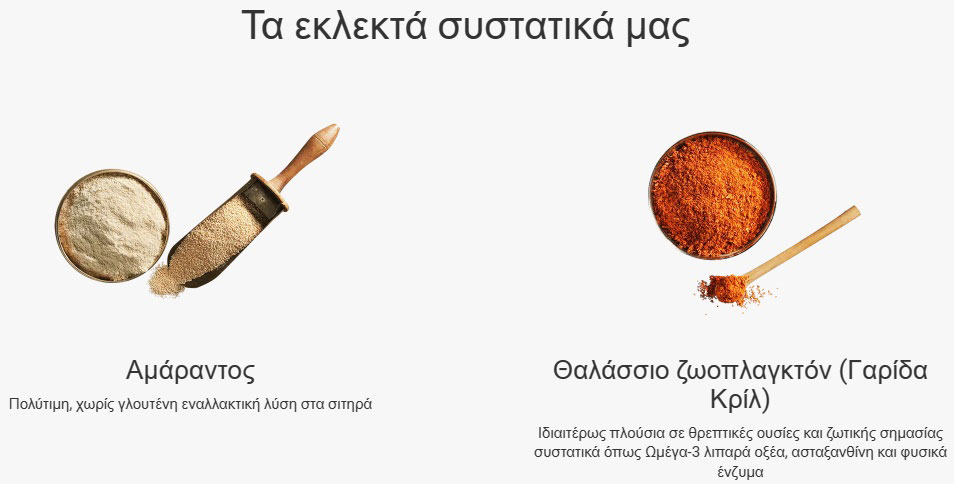 Αναλογία των ζωικών πρωτεϊνών στο σύνολο των πρωτεϊνών: 75% (Bοδινό 60%, Ψάρι/Γαρίδα Κρίλ 15%)
