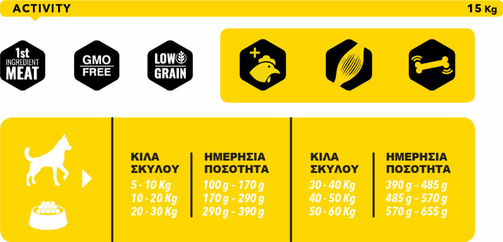 Η Amity Activity είναι μια πολύ εύγευστη ξηρά τροφή με πουλερικά και υδρολυμένο κοτόπουλο ιδανική για σκύλους με έντονη δραστηριότητα μεσαίων και μεγαλόσωμων φυλών. Έχει υψηλή περιεκτικότητα ζωικών πρωτεϊνών και λιπαρών ουσιών, υποβαθμισμένη περιεκτικότητα σιτηρών – Low Grain και δεν περιέχει μεταλλαγμένα συστατικά (GMO). Έχει ισορροπημένη αναλογία βιταμινών, μεταλλικών ουσιών, καθώς και φυτικών ινών, για καλή αφομοίωση, σωστή εντερική λειτουργία, ζωντάνια και ευεξία.