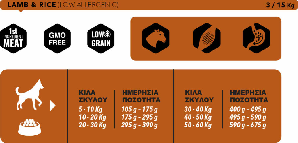 Η Amity Lamb & Rice είναι μια πολύ εύγευστη και ιδιαιτέρως εύπεπτη, Low-allergenic (περιορισμένης αλλεργικότητας) ξηρά τροφή, με αρνί, εύπεπτο ρύζι και πολύτιμο χαρούπι, πλούσια σε ζωική πρωτεΐνη, με υποβαθμισμένη περιεκτικότητα σιτηρών – LowGrain και χωρίς μεταλλαγμένα συστατικά (GMO). Η ειδική σύνθεση και η περιεκτικότητα της σε πρωτεΐνες, λιπαρές ουσίες και η μορφή της κροκέτας, την καθιστούν ιδανική για σκύλους μεσαίων και μεγαλόσωμων φυλών με φυσιολογική δραστηριότητα ή σκύλους με πεπτικά ή εντερικά προβλήματα, αλλεργίες – δυσανεξίες. Περιέχει την κατάλληλη αναλογία φυτικών ινών, βιταμινών, καθώς και μεταλλικών ουσιών για καλή αφομοίωση, σωστή εντερική λειτουργία, ζωντάνια και γενική ευεξία.